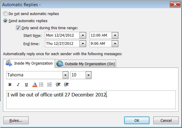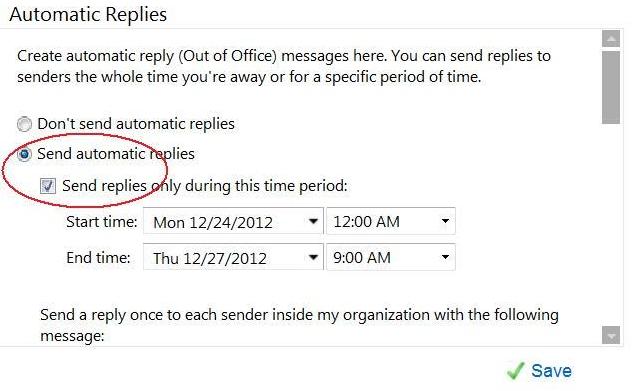6. You can then select a time frame during which you would like this Automatic Replies message delivered.