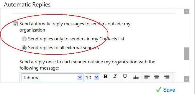 6. You also have the ability to set two separate Automatic Replies messages, or configure just one and not the other. In general, you will need to set both of auto reply messages in order to cover all staff, all students and all external bodies: