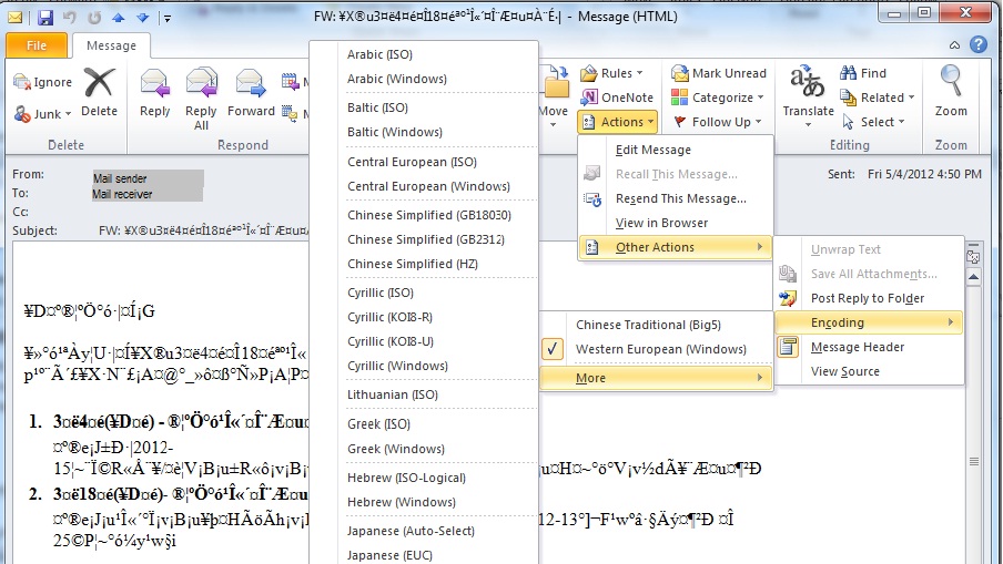 Your incoming mail may be composed with improper or undefined font encoding definition. Please try the following steps for a possible solution.