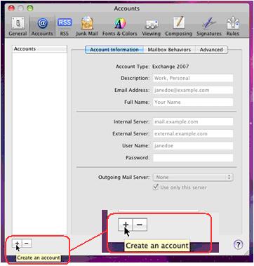 Note: You do not need to enter anything in the field for External Server. Exchange account access: Unlike Outlook, using MacMail to connect to our Exchange servers requires three separate applications to handle Email, Contacts and Calendar. The three programs are the following. |